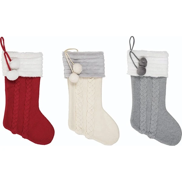 Cable Knit Christmas Stockings feature a homemade look with decorative tassels. Choose traditional red and white or fashion colors ivory and grey or grey and white. Ready to fill with all of your Christmas treats!