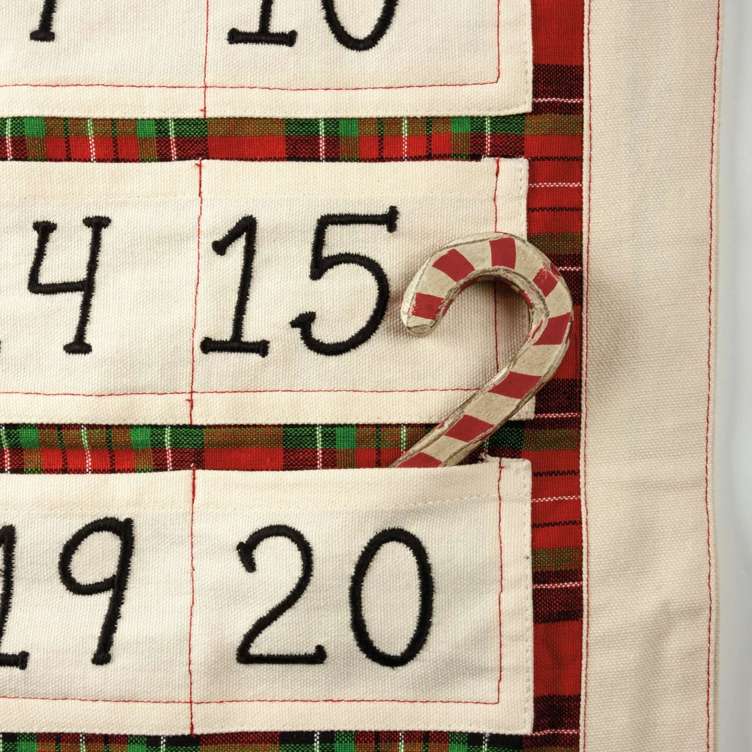 This Looks Like Christmas Countdown keeps track of the days left featuring numbered pockets and a wood candy cane to keep track of the countdown. Fun with little treats too! Calendar is attached to wooden rod and hangs from attached cotton tape loop.