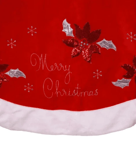 This Merry Christmas Poinsettia Tree Skirt features bold red color and white border is accented with a red and gold sequined poinsettia design, accompanied with the words, “Merry Christmas” embroidered in gold. A perfect finish for a larger tree.