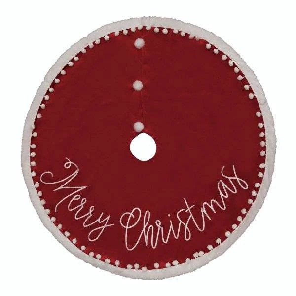 - This Merry Christmas Pom Pom Tree Skirt 48″ features a pretty red tree skirt with Merry Christmas script in white and white pom pom trim.