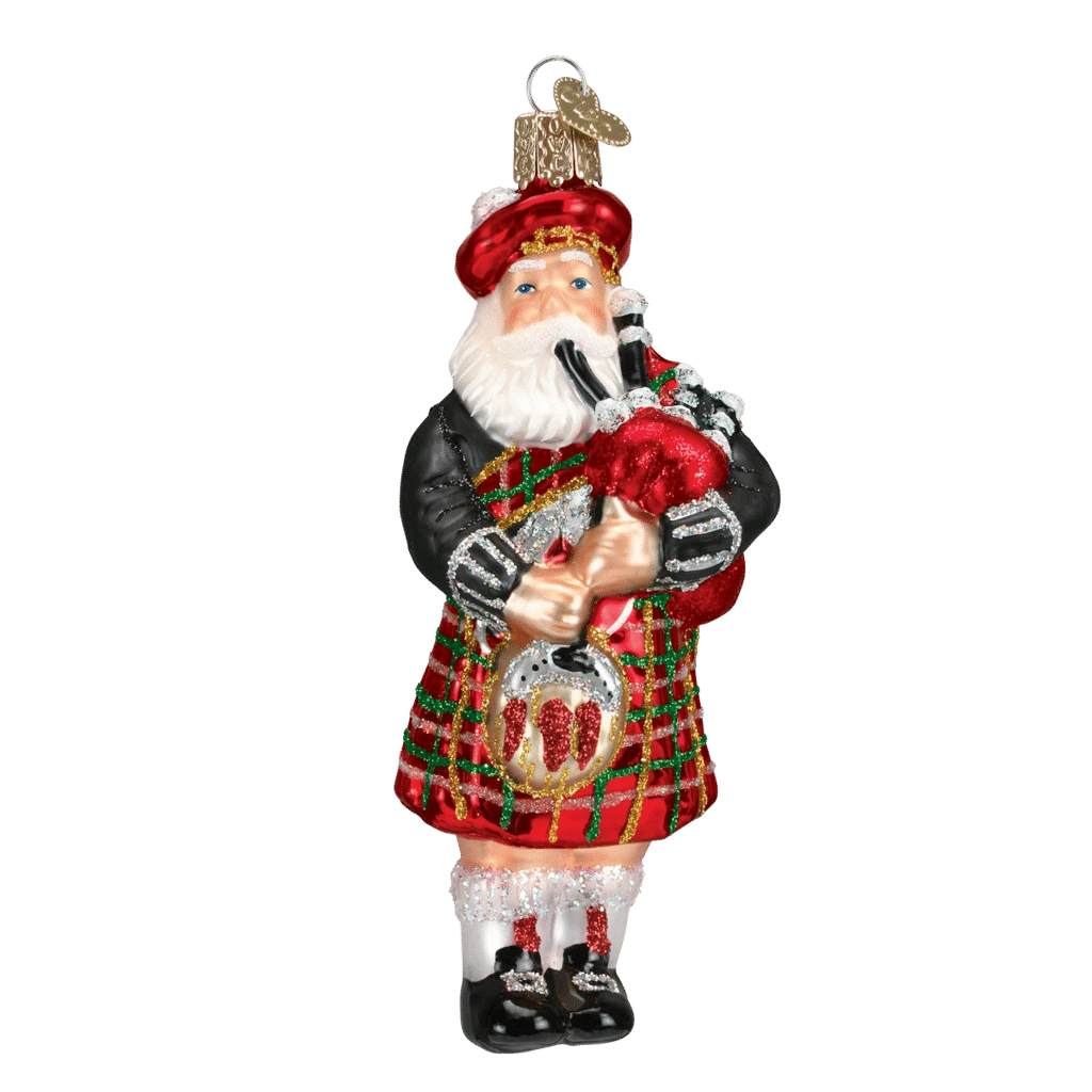 The legend of Santa Claus is derived from the European figure of St. Nicholas. Throughout the world he became the folk hero all children dream about on Christmas Eve. This Santa proudly wears a traditional tartan kilt and other clothing of the Scottish highland, as well as playing the popular musical instrument, the bagpipes.